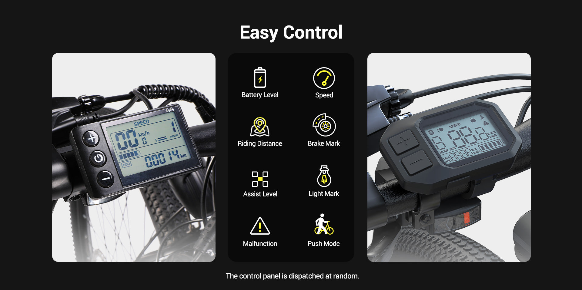 Información: Velocidad, Nivel de batería, Distancia recorrida/Odómetro, Nivel de asistencia, Modo caminar, Marca de luz, Código de error, Marca de freno/mal funcionamiento, etc..