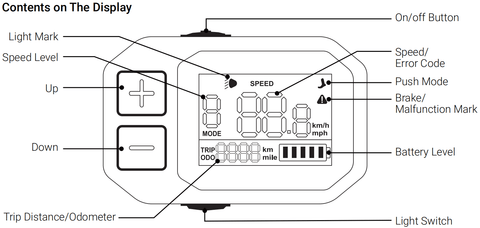 Suppression des données ODO : lousque l'écran est allumé, appuyez longuement sur le bouton marche/arrêt pendant 8 secondes jusqu'à ce que l'écran clignote. Les données ODO seront supprimées au redémarrage de l'écran.