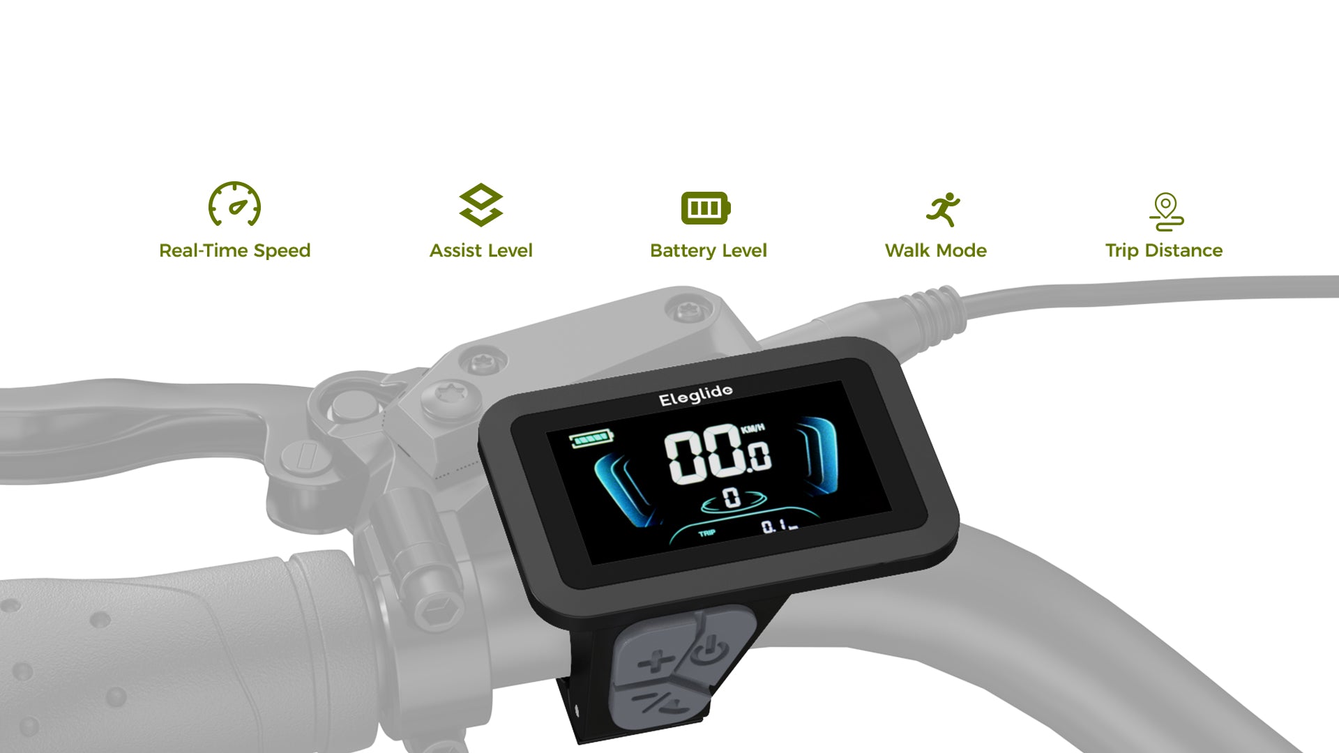 Informations : vitesse en temps réel, niveau d'assistance, niveau de batterie, mode marche, distance parcourue