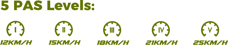 Niveaux PAS : 12/15/18/21/25 km/h (niveau 1-5)