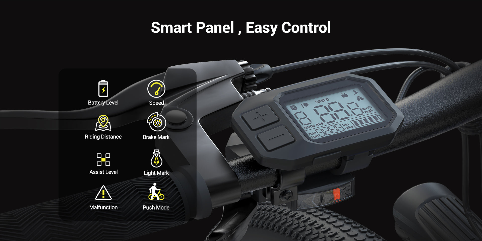 Information: Speed, Battery Level, Trip Distance/Odometer, Assist Level, Walk Mode, Light Mark, Error Code, Brake/Malfunction Mark, etc.