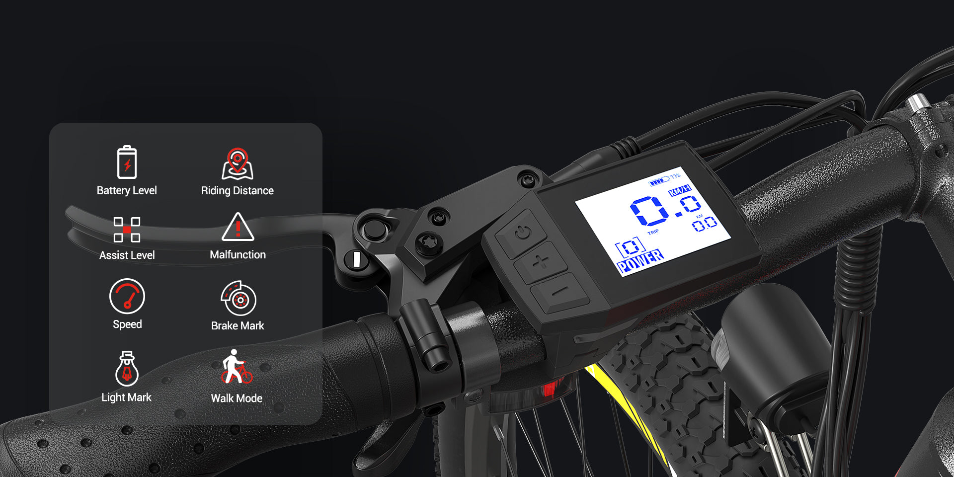 Information: Speed, battery level, trip distance/odometer, assist level, walk mode, light mark, brake mark