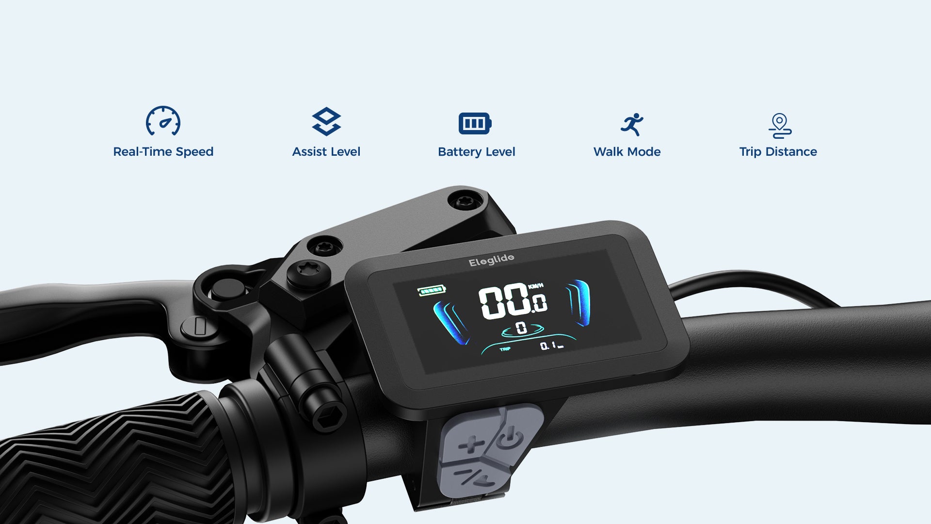 Information: Real-Time Speed, Assist Level, Battery Level, Walk Mode, Trip Distance